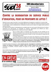 SUD édu­ca­tion appelle à un temps fort de grève le mardi 31 mars et à pour­suivre et ampli­fier la mobi­li­sa­tion au cours de la semaine suivante.